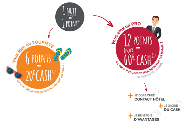 Notre programme de fidélité Contact & Moi est gratuit, simple et hyper avantageux. A chaque nuit passée dans l’un de nos établissements, vous cumulez un point (1 nuit = 1 point ).
