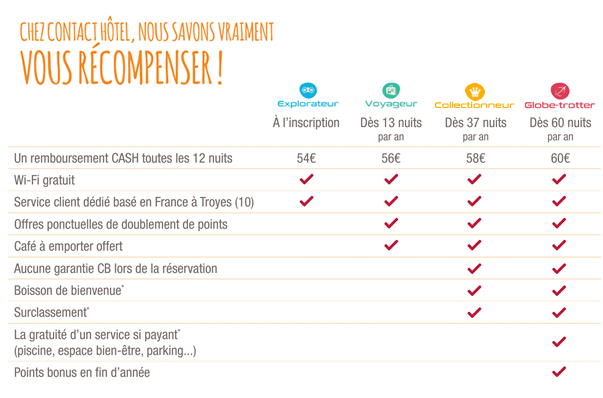 Notre programme de fidélité Contact & Moi est gratuit, simple et hyper avantageux. A chaque nuit passée dans l’un de nos établissements, vous cumulez un point (1 nuit = 1 point ).