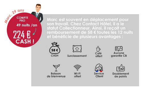 III. There are two types of accounts: with the Leisure account “TOURISME”, once a Member has saved up 6 points, he/she is refunded half the cost of their last night, based on the price of the room occupied, plus 1 breakfast (if eaten and paid for), up to a maximum of 20 €. With the PRO account, Members must go to 2 different Contact Hôtel hotels. Once he/she has saved up 12 points, he/she is refunded up to a maximum of 60 €* depending of the Member status and the price of the last room occupied, plus 1 breakfast (if eaten and paid for).