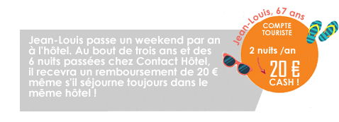 1. Le compte TOURISME : ce compte est destiné aux clients réalisant au minimum deux nuitées par an à l’hôtel. Le membre bénéficiera d’un remboursement de 20 € tous les 6 points de fidélité obtenus dans le Groupement Contact Hôtel qu’il ait acquis les points dans un ou plusieurs établissements. Il ne bénéficie pas des avantages du compte PRO.